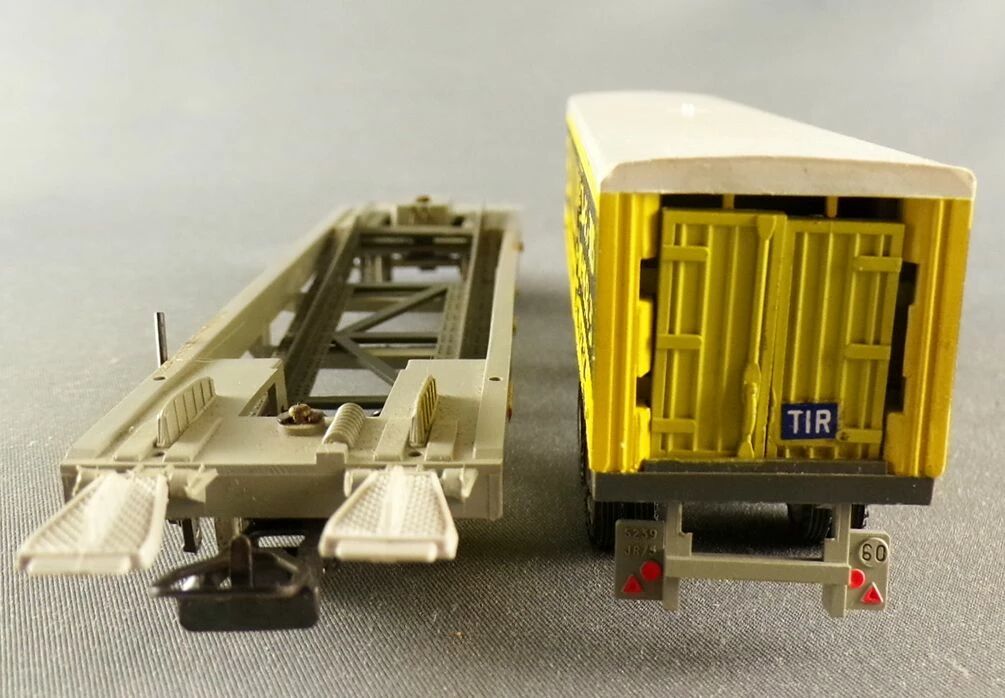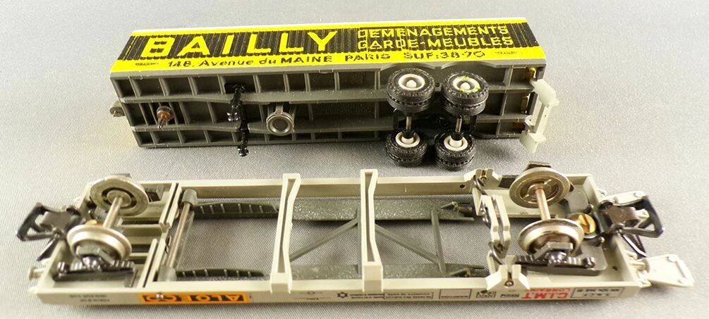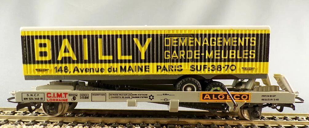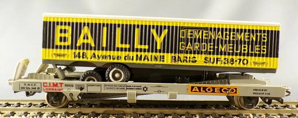 Jouef 6965 Ho Sncf C.I.M.T Lorraine Algeco kangaroo wagon with Bailly truck trailer. Very good condition, metal wheels, universal couplers, The rear doors of the trailer are a bit temperamental when opening, no box.