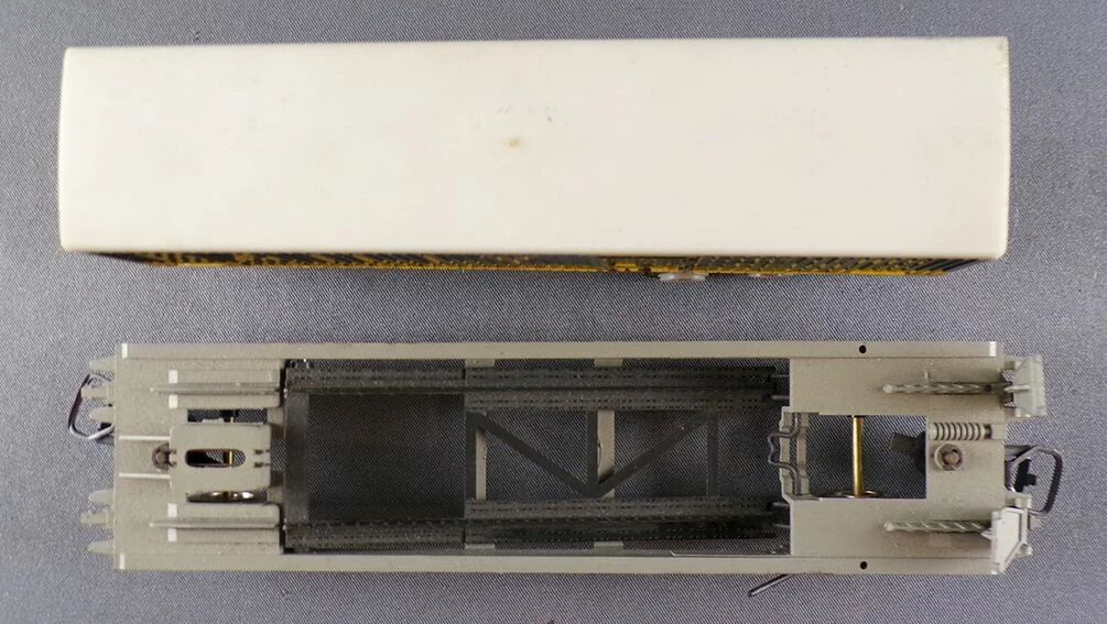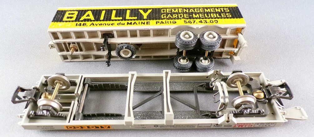 Jouef 6965 Ho Sncf wagon plat à poche kangourou avec remorque routière Bailly. Immatriculation : NM 524346, châssis plastique gris clair, inscriptions sérigraphiées « C.I.M.T Lorraine Algeco » sur le châssis, attelage international vissé au châssis, roues métalliques. longueur 160 mm. Très bel état, sans boite.