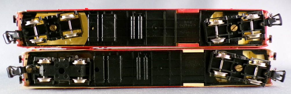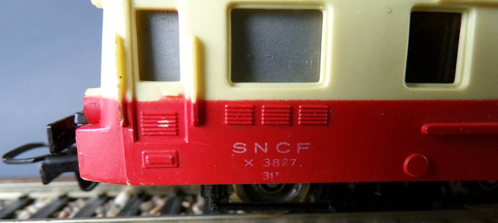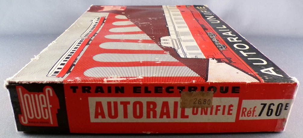 Jouef 760E Ho Sncf Unified 300CV Picasso railcar 2-piece set from Evreux home station, Conflans Mantes Line 2nd Class motor car with guard's compartment X 2827 + Trailer XB 8147 2nd Class. Red and cream livery. Length 243mm each. Good condition, clean pad printing, interior fittings, complete, buffers ok, metal wheels, no lighting, small piece of underbody broken on the trailer. Tested, works, original box complete, thermoformed plastic insert still clean, lid with some marks, taped at the corners.