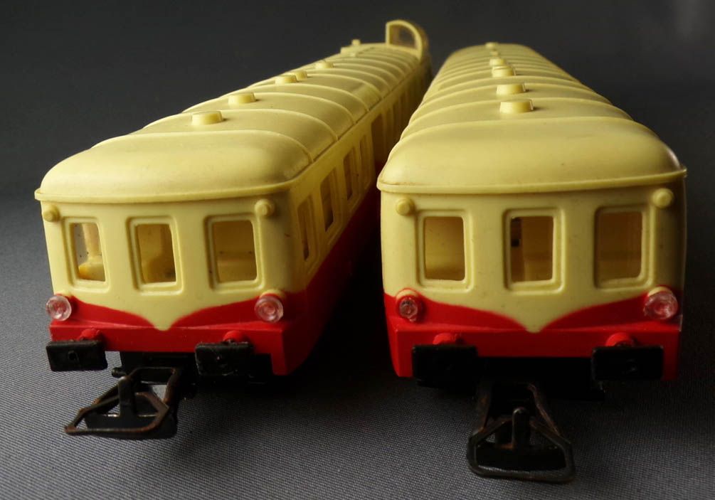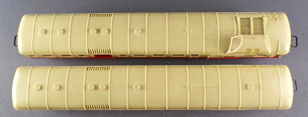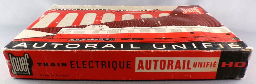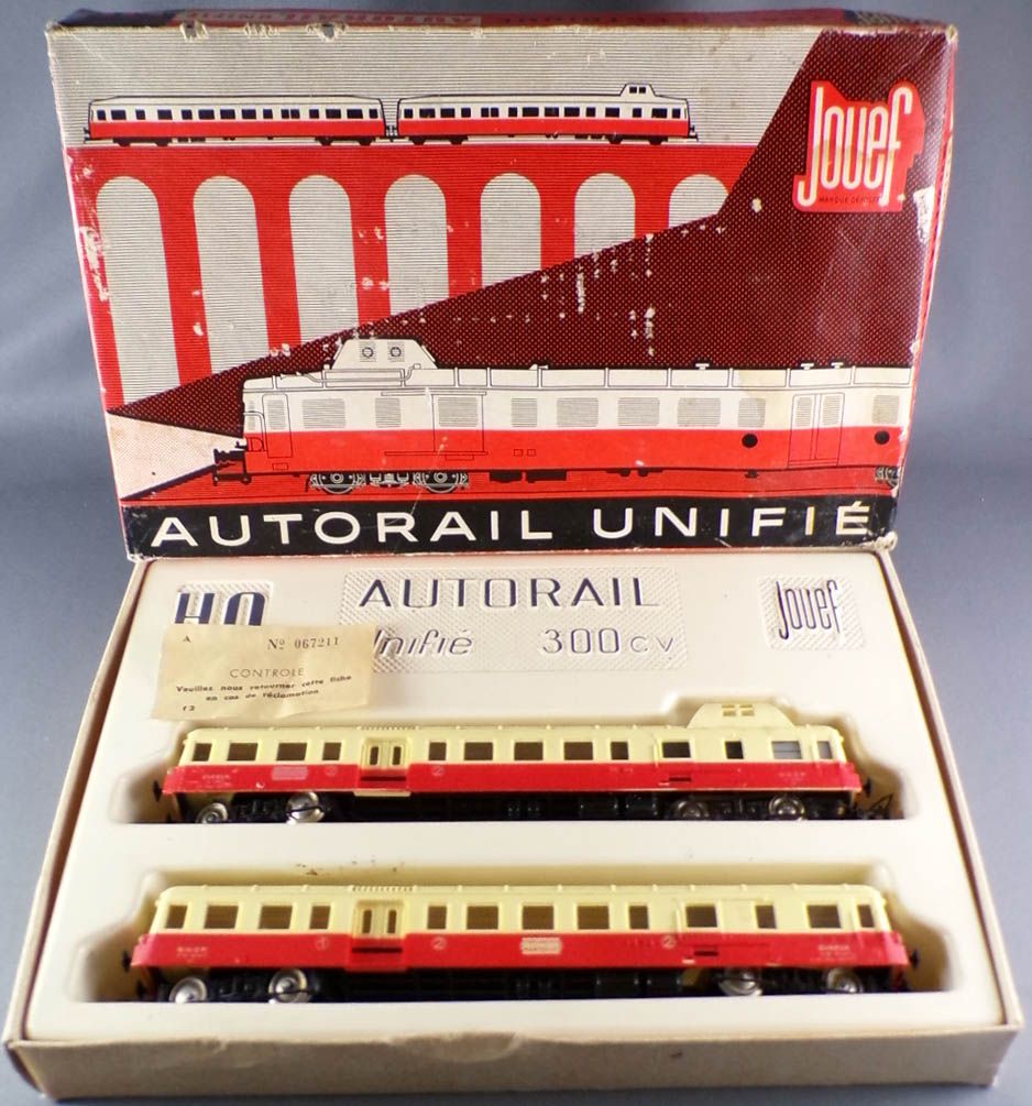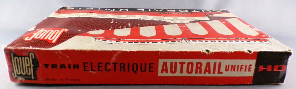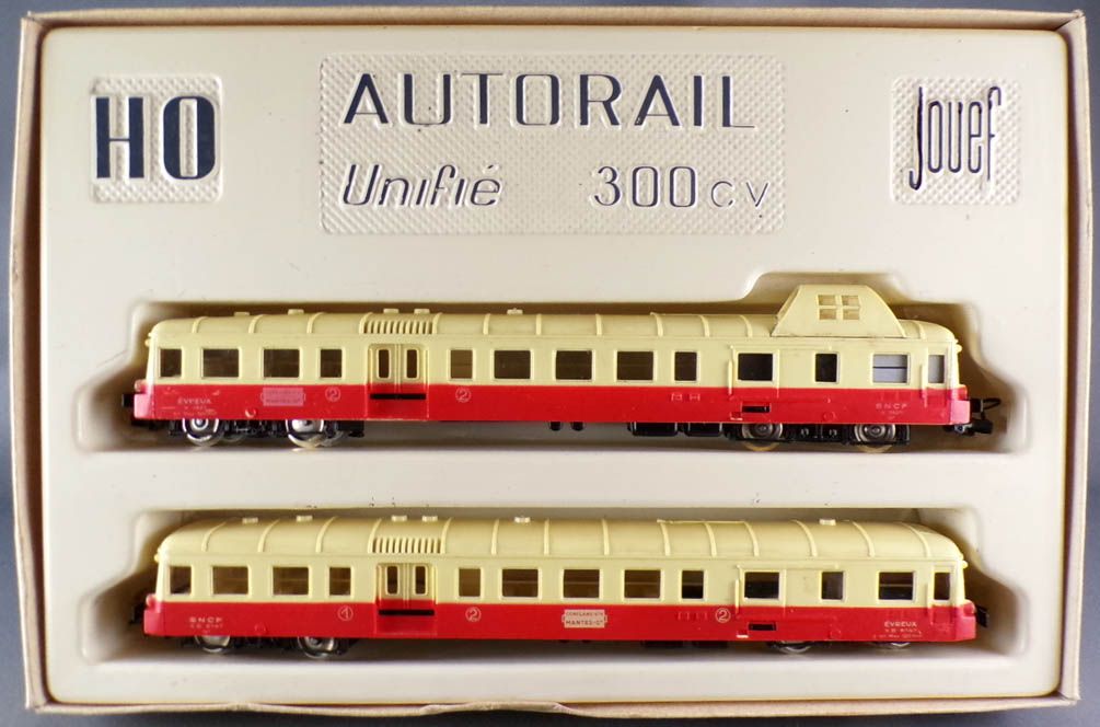 Jouef 760E Ho Sncf Coffret Autorail Unifié 300CV Picasso 2 éléments dépot d'Evreux Ligne Conflans Mantes Motrice partie voiture 2ème Classe à guérite X 2827 + Remorque XB 8147 2ème Classe Livrée rouge et crème. Longueur 243mm chaque. Bel état, tampographie propre, aménagement intérieur, complètes, tampons ok, roues métal, pas d'éclairage, un petit bout de bas de caisse cassé sur la remorque. Testée, fonctionne, Boite d'origine complète, encart plastique thermoformé encore propre, couvercle avec quelques traces, scotché aux angles.