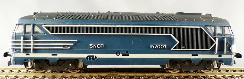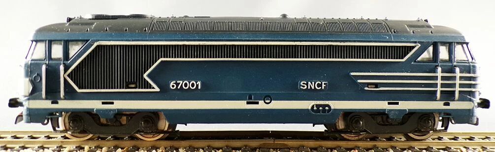- 1 BB 67001 diesel locomotive with lighting on both sides, blue livery with white stripes, length 187 mm, 12-volt motor, 5 poles, spur gear drive, 1 motor bogie, 2 tyred axles, grey plastic bogies, metal axles, international couplings without loops screwed to the bogies, reference 8411
