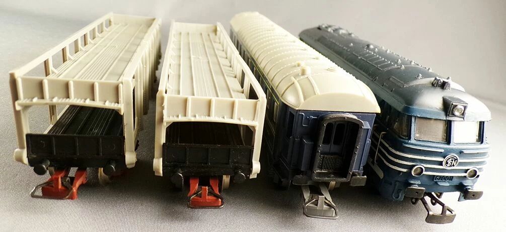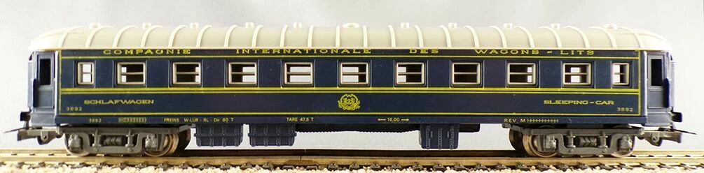 - 1 Ciwl sleeping car no. 3892 Blue livery with yellow markings Length 230 mm, added buffers & inter-carriage buffers, no interior fittings, international couplings moulded with the bogie, metal wheels