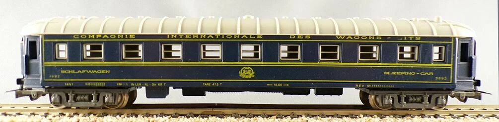- 1 voiture Lits Ciwl n°3892 Livrée bleu marquage jaune longueur 230 mm, tampons & bourrelets d'intercirculation rapportés, pas d'aménagements intérieurs, attelages internationaux moulés avec le bogie, roues métalliques