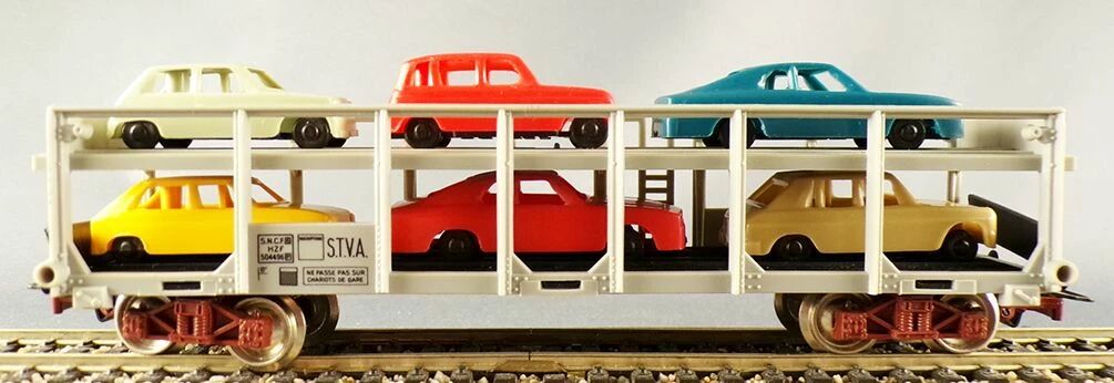 - 2 Wagons porte-autos HZf 504496 livrée gris clair longueur 170 mm, bogies Diamond, attelages internationaux moulés avec le bogie, roues métalliques