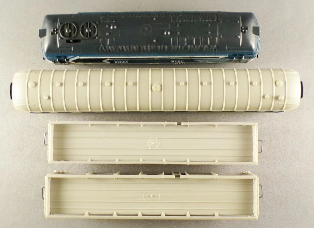 - 1 Locomotive diesel BB 67001 avec éclairage des deux cotés, livrée bleu bandes blanches, longueur 187 mm moteur 12 volts, 5 pôles, entraînement par engrenages droits, 1 bogie moteur, 2 essieux bandagés, bogies plastique gris, essieux métalliques, attelages internationaux sans boucle vissés aux bogies référence 8411