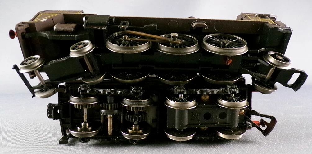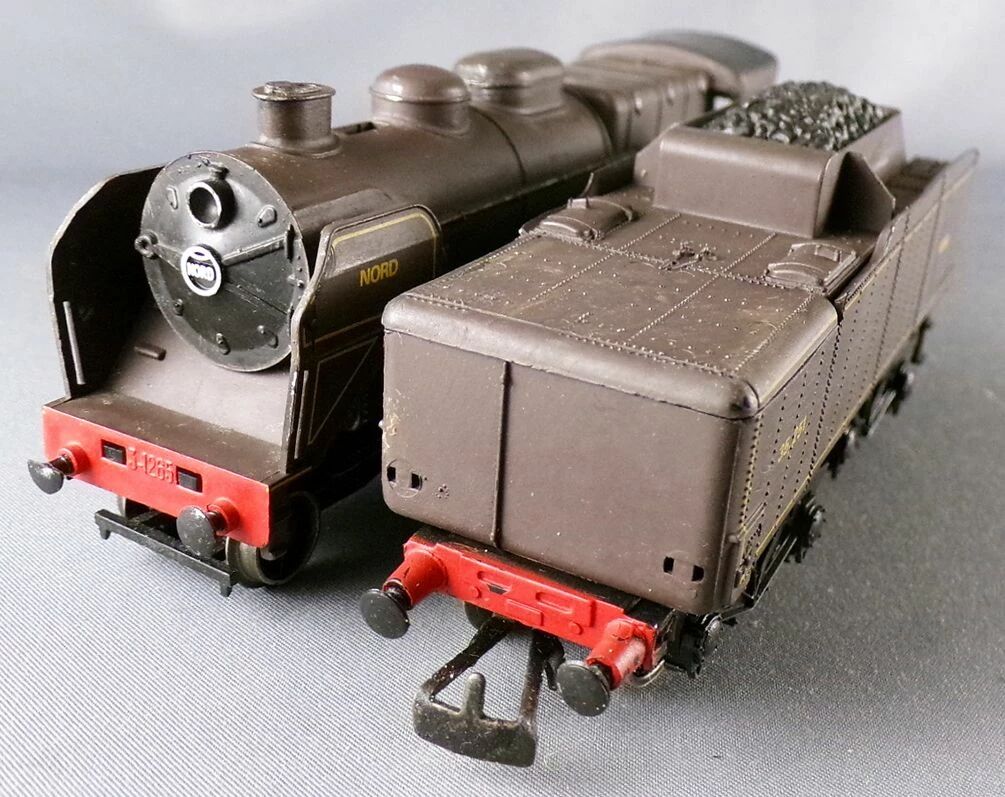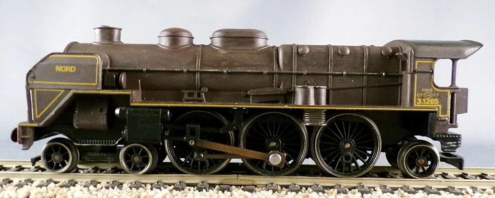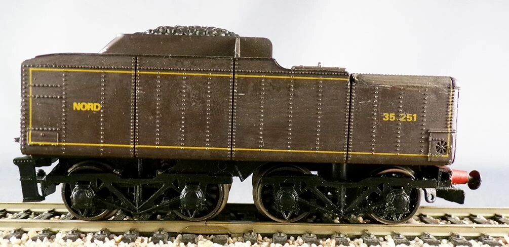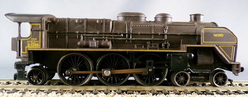 Jouef 8252 Ho Nord Steam Locomotive 4-6-2 231 C 3.1265 Pacific Tender 3551 attached to the station Fives, brown livery with yellow lining. Tender registration: 35.251 NORD, attached to the station Fives, brown plastic body with yellow lining, black plastic chassis, 5-pole motor mounted flat in the tender, motor drive via straight gears, 2 flanged axles, metal axles. Length 274 mm. Very good condition, buffers OK, one step of the left locomotive footplate broken, tested, works, hasn’t run for a long time, a little lubrication/break-in will be good for it, without box.