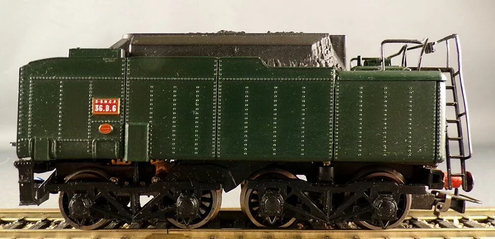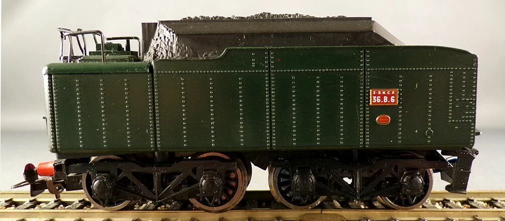Moteur 5 pôles dans le tender, entraînement moteur par engrenages et vis sans fin, 2 essieux bandagé, attelages internationaux sans boucle, essieux bruni. Longueur 257 mm. 12V CC analogique