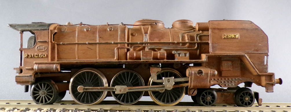 Jouef 835E Ho Sncf Loco Vapeur 231 C 3.1265 Pacific Nord Tender 3560 avec éclairage avant, repeinte, patinée. Inscriptions en relief 231 C 60 sur la traverse avant, inscriptions en relief 231 C 60 et Jouef sur la cabine, inscriptions en relief 2 SNCF sur les pare-fumées. Moteur saucisson 3 poles logé dans la chaudière, entraînement moteur par engrenages droits, pas d'essieux bandagés, essieux porteurs plastiques. Tender 35-60 essieux avec roues plastique noir, axe métallique, attelage international sans boucle. Longueur 274 mm