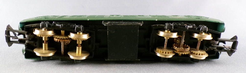 Jouef 837 Ho Br Locomotive diesel D 6100 livrée vert 12V années 1962 1964 moteur saucisson, à deux sorties axiales, attelage à croc type Jouef moulé avec le bogie. Longueur 170 mm. Très bel état, complète, a peu roulé, testée, fonctionne bien, sans boite.