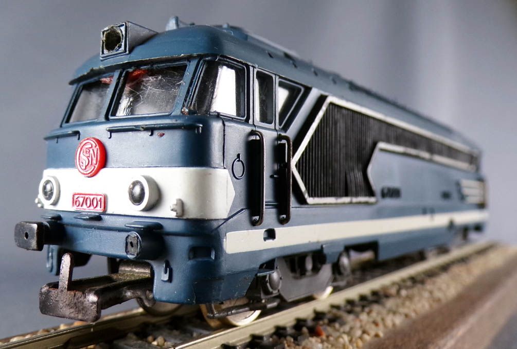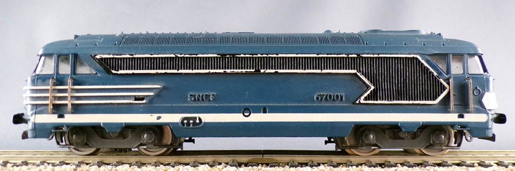 Jouef 8410 Ho Sncf Diesel Loco BB 67001 blue & white livery, black buffers. Length 185 mm. 1 drive bogie with two drive axles with bogie tyres. Used condition, missing one buffer, one headlight under the cab and both on the roof in front of the horns, no box, tested, works, no lighting.