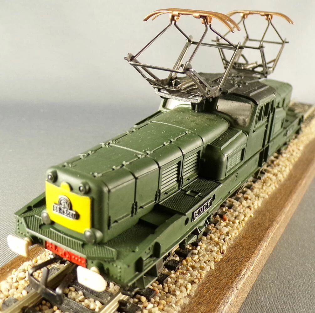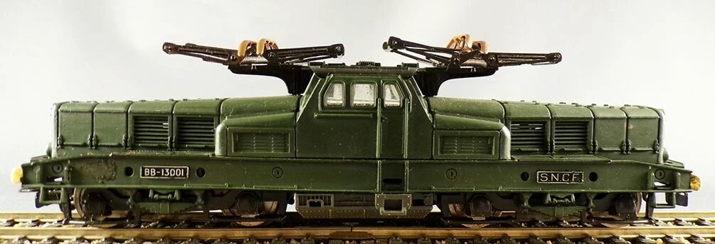 Jouef 842E Ho Sncf Electric loco BoBo BB 13001 East Line Metz Thionville, green and yellow livery. Length 173 mm. Very good condition, white buffers (missing one), pantographs ok, tested, run well, lightning ok, no box.