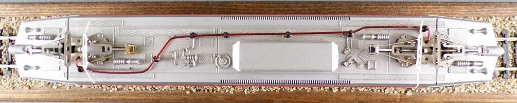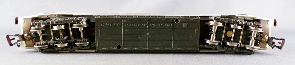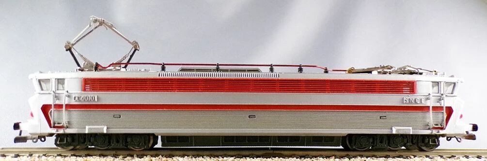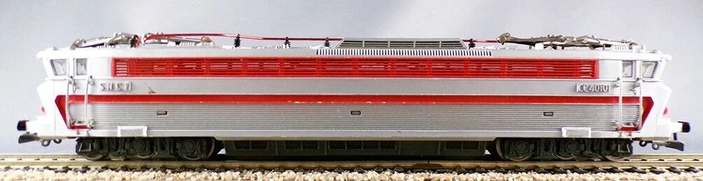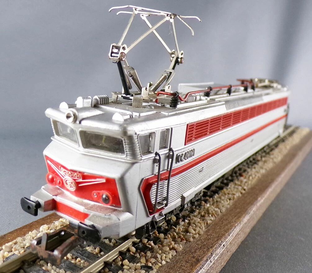 Jouef 843EI Ho Sncf Loco électrique CC 40101 livrée inox & rouge avec éclairage inversé. Longueur 245 mm, inscriptions en relief CC 40101 et SNCF sur les flancs de la caisse, châssis métallique encliqueté dans la caisse, réservoirs plastique gris vissés au châssis, pas d'inscriptions sur le châssis, moteur 12 volts, 3 pôles, entraînement par engrenages droits, arbre de transmission aux deux bogies moteur, essieux, métalliques, attelages internationaux sans boucle vissés aux bogies. Très bel état, tampons, ligne de toit, mains montoir ok, manque ressort sur deux pantographes, testée, fonctionne bien, éclairage ok par intermittence, ampoules certainement à revisser.