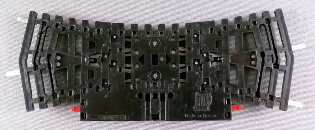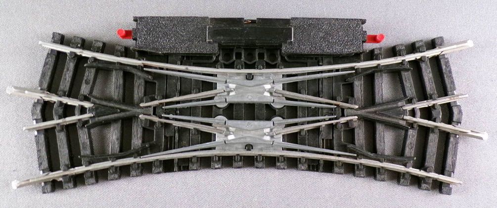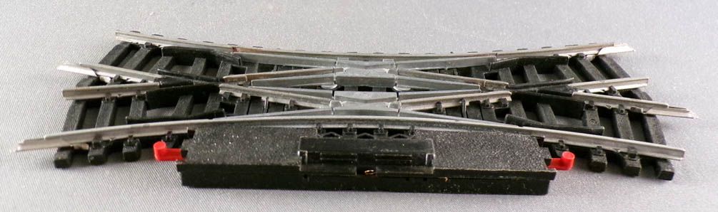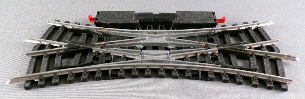 Jouef 848E Ho Traversée jonction double électrique rails acier 22°30 R 385. Très bon état sans boite, complète avec éclisses, fils coupés, à recabler.