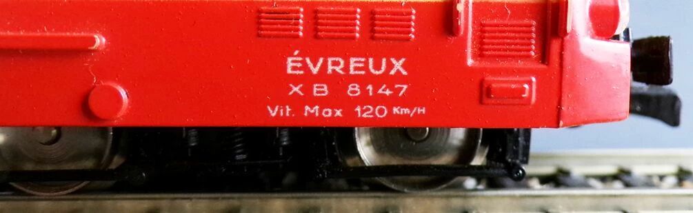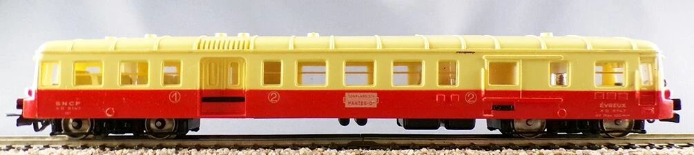 Jouef 851 Ho Sncf Trailer XB 8147 affected to the station of Evreux with interior fittings for railcar 300CV Picasso red & yellow Livery. Length 243mm, SNCF screen-printed lettering, registration number, route plate and class numbers on the sides of the body, metal wheels. Very good condition, without box, complete, buffers ok