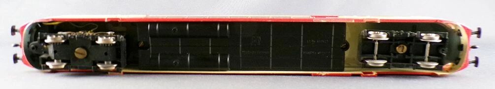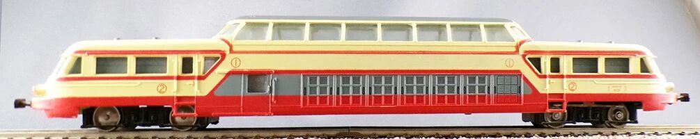 Longueur 305 mm. Caisse plastique rouge/beige, inscriptions sérigraphiées « GENEVE-NICE « et chiffres de classe sur les flancs de la caisse, inscriptions sérigraphiées « SNCF 34 T-X 4203 » (jaune sur fond rouge) sur les flancs de la caisse, vitrage compartiments extrêmes plastique gris, toiture/kiosque plastique jaune, toit peint en gris, vitrage kiosque plastique translucide d'une seule pièce, tampons et attelage factice rapportés, châssis central plastique noir, réservoirs plastique noir vissés au châssis et toiture, inscriptions en relief Jouef, Made in France, Modèle déposé et « Réf. 852 » sur le châssis, moteur 12 volts CC, entraînement moteur par vis sans fin, 1 bogie moteur.