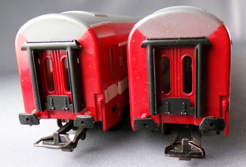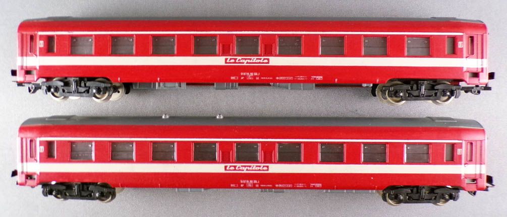 Jouef 8670 Ho Sncf 2 x type Y Uic A9 1st class car registration number 518719-90351-1. Red livery ex Capitole grey roof. Silk-screened ‘1’ inscriptions at access doors and