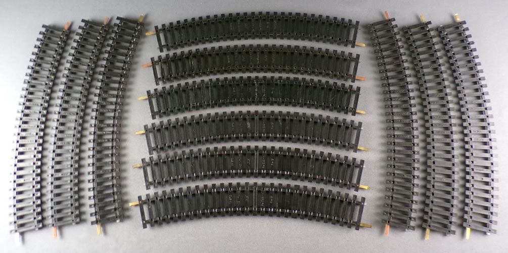 Jouef 870 Ho 12 steel curved rails R = 385mm 15°. Very good condition, complete with joiner on both ends