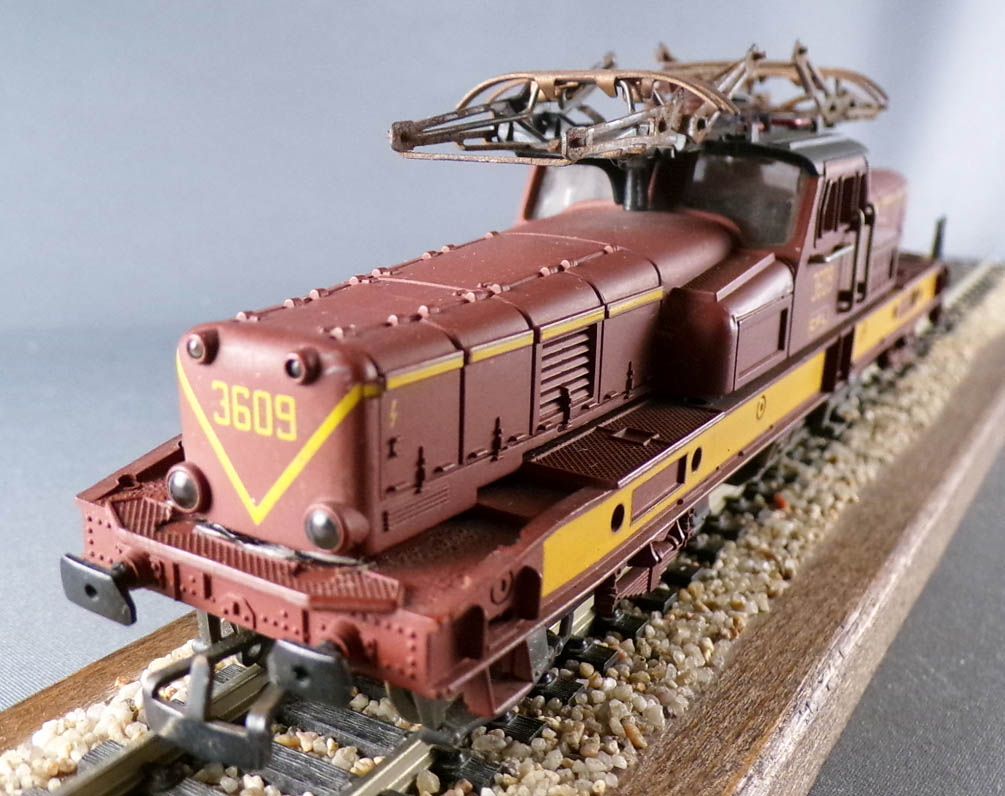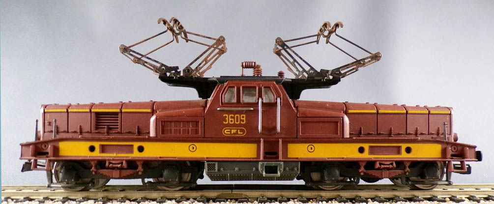Jouef 8845 Ho Cfl (Luxembourg) BB 3609 electric locomotive in brown and yellow livery, articulated pantographs, added roof accessories and circuit breakers, added buffers, grey plastic tanks screwed to the chassis, spur gear drive, 1 motor bogie, 2 banded axles, grey plastic bogies, metal axles, equipped for reverse lighting, international couplings without loops screwed to the bogies. Length 173 mm. 12-volt motor.