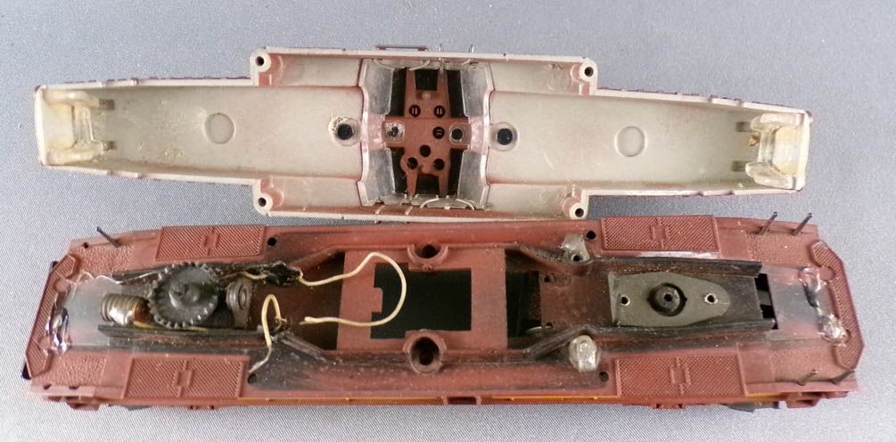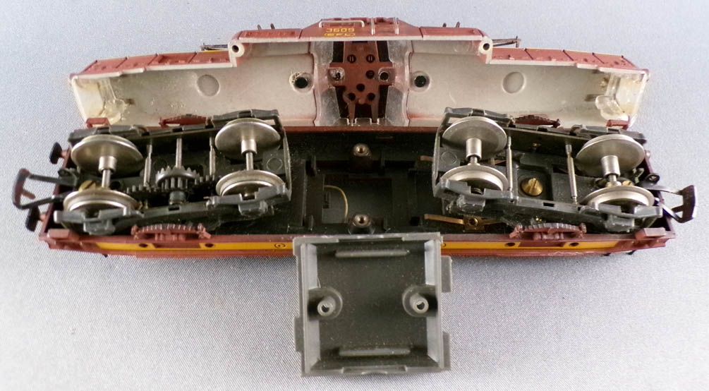 Good condition, slight oxidation on pantograph arms, two buffers and three black handrails missing, no motor, screws for attaching the casing to the chassis and body missing, as well as the light bulb, no box.