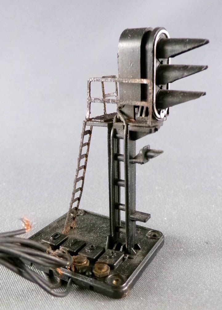 Jouef 9311 Ho 1 Signal de Voie Cablé 3 Feux 2 Lampes. Bon état sans boite d'origine, avec cablage, petite corrosion des parties  métalliques, testé, fonctionne.