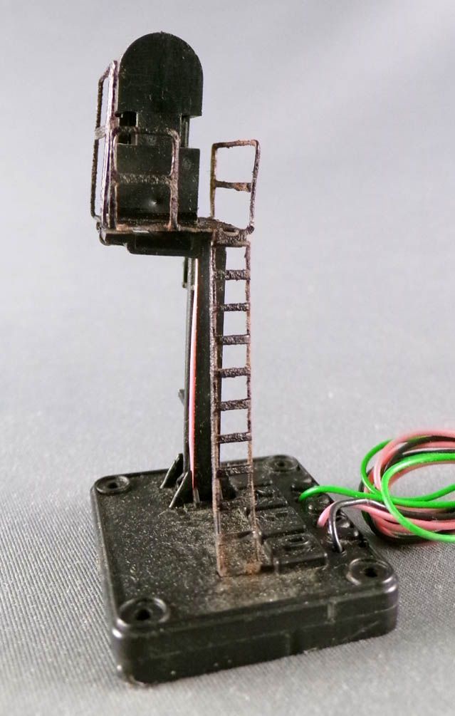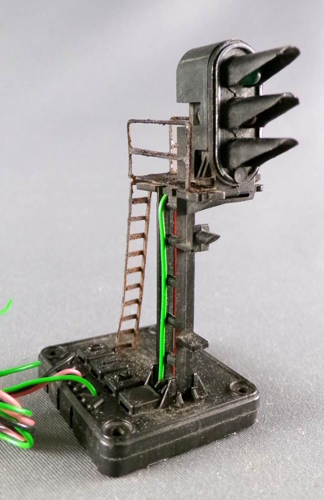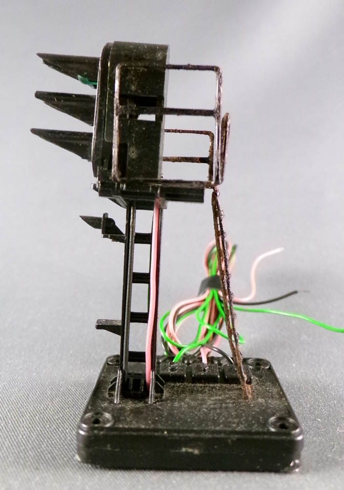 Jouef 9312 Ho 1 signal de voie cablé 3 feux 2 lampes. Très bel état sans boite d'origine, avec câblage, tyrès légère corrosion sur les pièces métalliques, testé fonctionne.