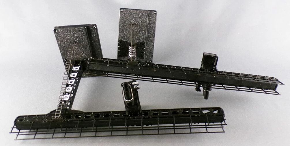 Jouef 933 Ho 2 Potences de signalisation avec 1 nacelle non câblée + Panneaux. Neuves en boite, jamais utilisées, quelques panneaux sont détachés de la grappe.