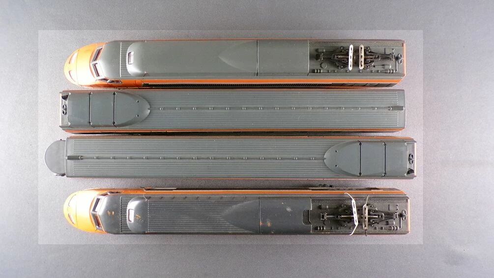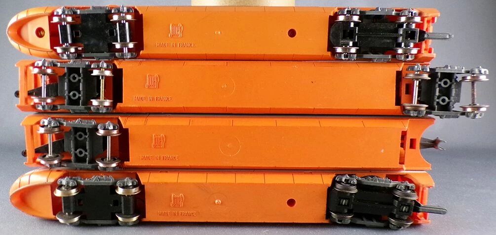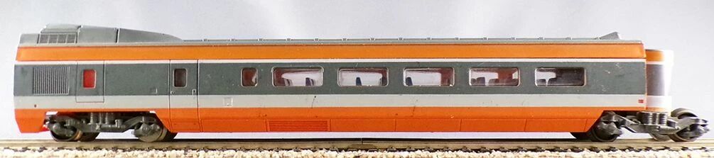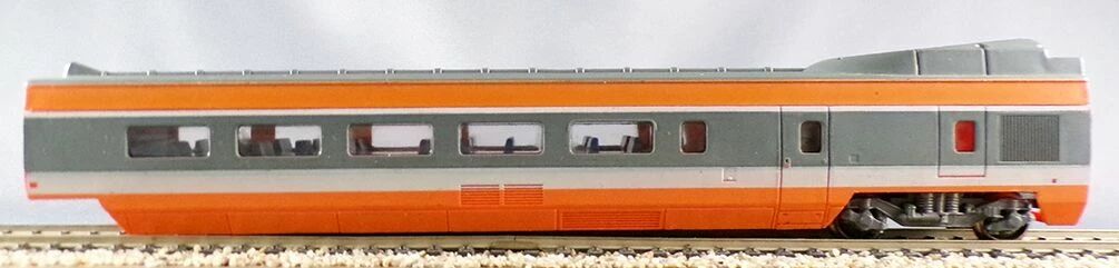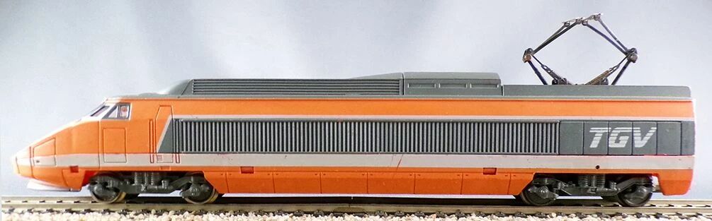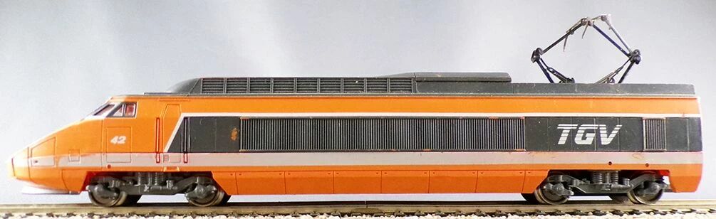 Jouef Ho Sncf South-East Line Orange Tgv N°42 4 parts. One power car, one 1st Class coach, one 2nd Class coach, one dummy driving unit. Version with engine in the power car, metal wheels. Without box, good condition, some marks, metallic pantographs ok (outer edges of the bow missing on the locomotive), interior fitting, marking 42 only on the dummy. No box, no lightning version, tested, works perfectly.