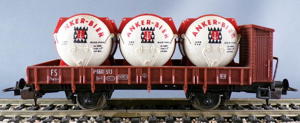 Accueil > Modélisme Ferroviaire > Modélisme Ferroviaire - Echelle Ho > Modélisme Ferroviaire Echelle Ho - Wagons > Lima 2818 Ho Fs Wagon Plat 2 Essieux à Guérite P660 513 avec 3 Fûts Anker-Bier sans Boite
