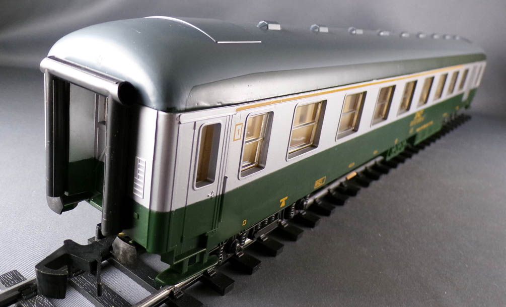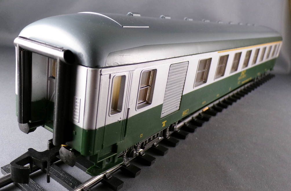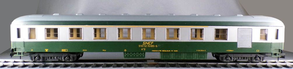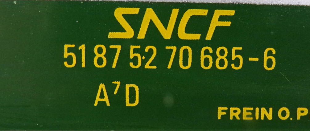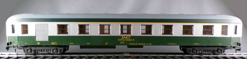 Lima 6643 0 Gauge Sncf Uic Lugages Van 1st Cl Coach A7D type n° 518752-70685-6 silver & green Livery grey roof yellow stripes. With interior fitting with compartments. Length 492 mm. Very good condition, buffers, running boards & couplers ok, a tiny mark on one side near the number plate and two micro scratches on the roof, no box.