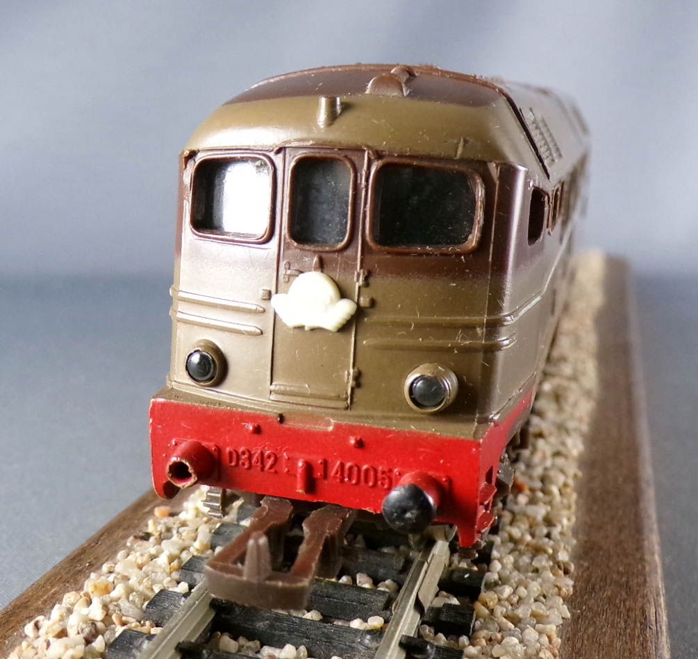 Lima 8023 Ho Fs locomotive diesel D 342 livrée havane bande rouge dédiée au trafic des lignes secondaires tant voyageurs que marchandises. Attelage à boucle d'un coté, sans boucle de l'autre, un bogie moteur, deux essieux bandagés. Longueur 165 mm. Très bon état, manque un tampon et la vis de fixation chassis/carrosserie, le puit de vis est manquant et il ya donc un trou dans la toiture à son emplacement, testée, fonctionne, pas d'éclairage d'origine, sans boite.