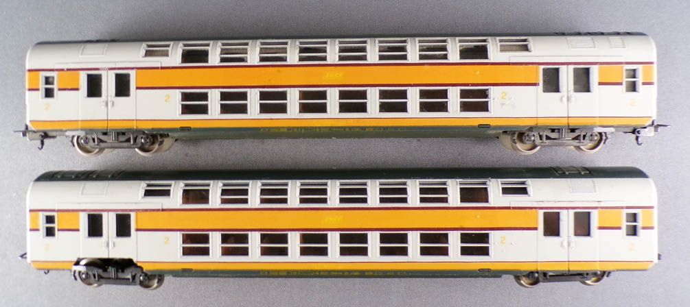 Accueil > Modélisme Ferroviaire > Modélisme Ferroviaire - Echelle Ho > Modélisme Ferroviaire Echelle Ho - Voitures Voyageurs > Lima 9231 x 2 Ho Sncf 2 Voitures Intermédiaires VB2N Banlieue 2 Niveaux 2° Classe Type Bc sans Boite
