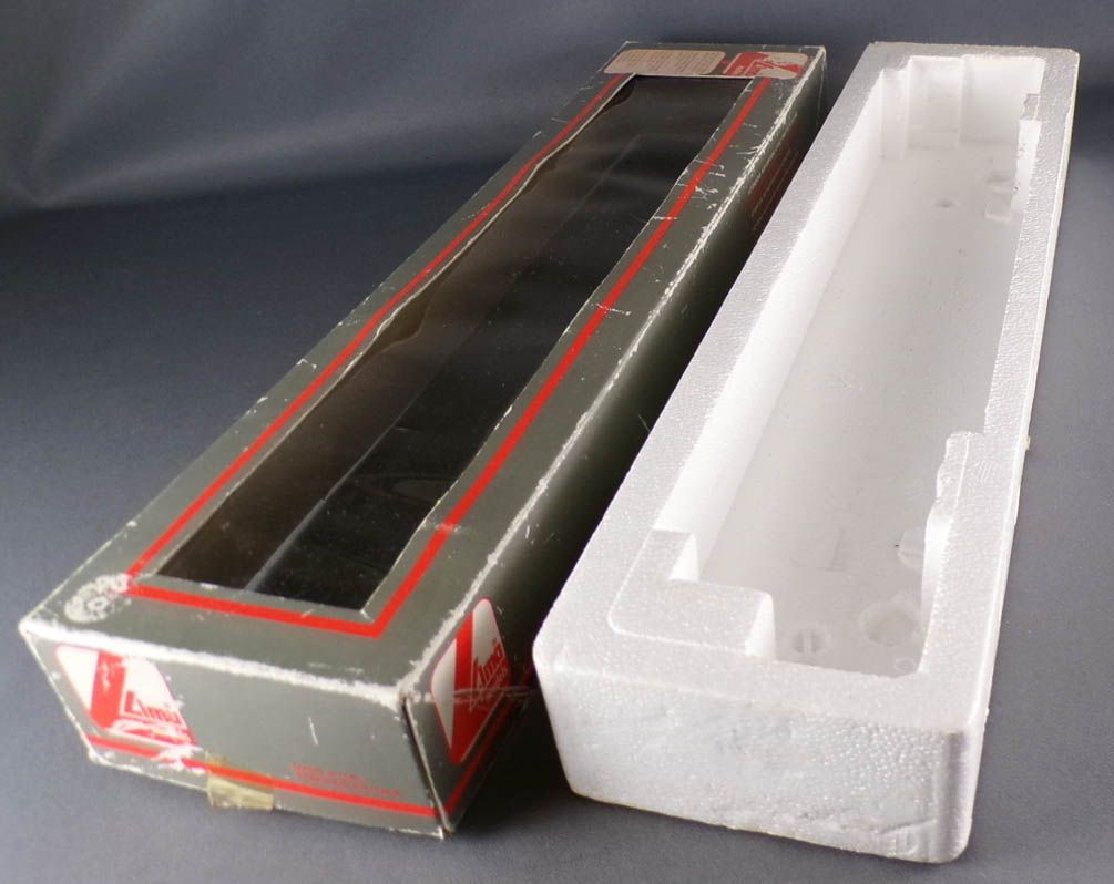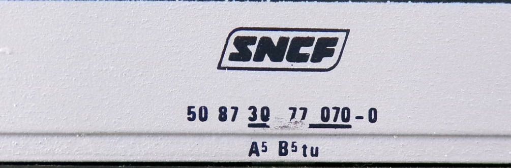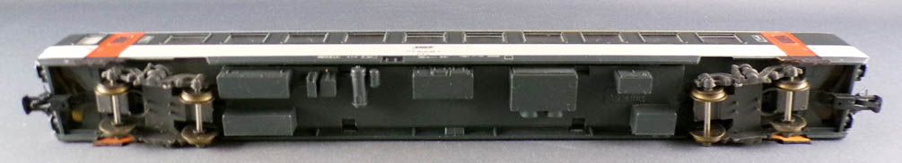 Aménagement intérieur. Longueur 303 mm. Roues métal bruni, essieux isolés 2 rails cc, attelages à élongation, boitier Nem. Très bon état en boite d'origine, complète, tampons ok, juste une petite trace sur une immatricultion sur une face, boite défraichie. Voir photo