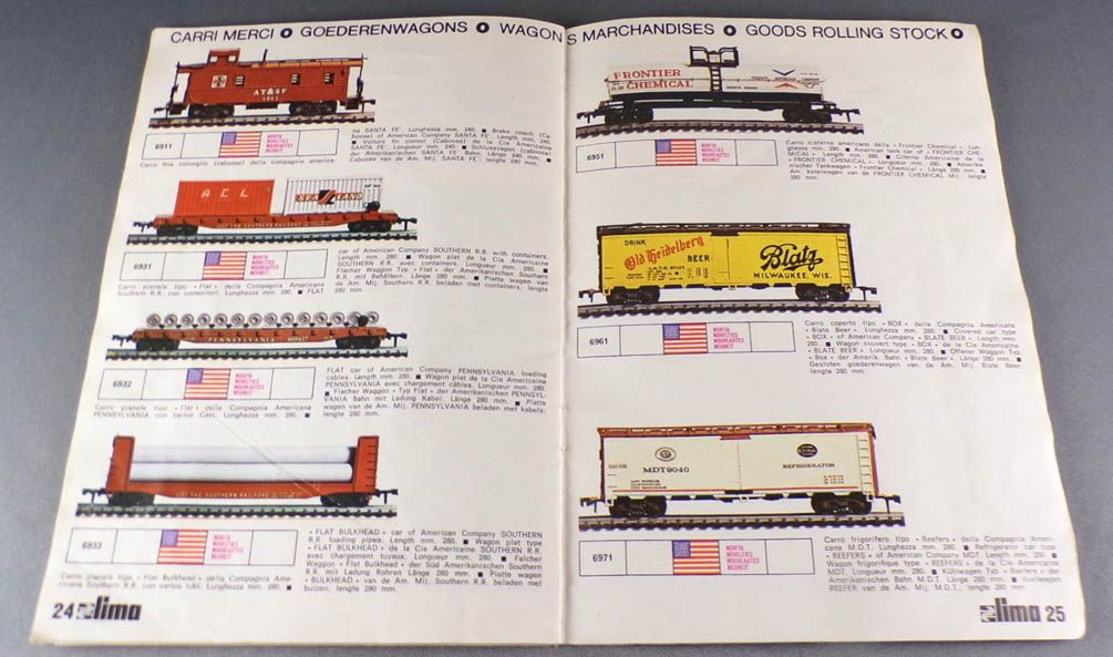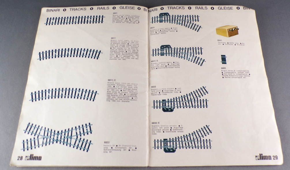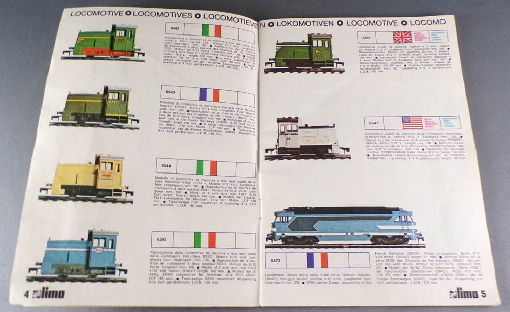 Lima O Catalogue multilingue 1973/74 32 pages pouleur 21,3 x 15 cm. Toute la gamme de trains échelle O matériel roulant, locos vapeurs, électrique,s diesels, voitures, wagons, accessoires, rails, plans de réseaux. Bel état, pages bien propres.