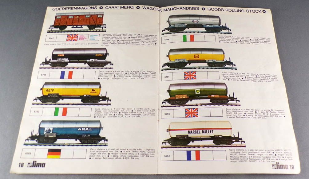 Lima O Scale 1973/74 multi-language catalogue, 32 colors pages 21,3 x 15 cm incuding steam, electric and diesel locos, wagons, coaches, tracks, accessories and layout. Very good condition, very clean pages.