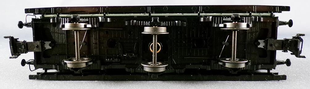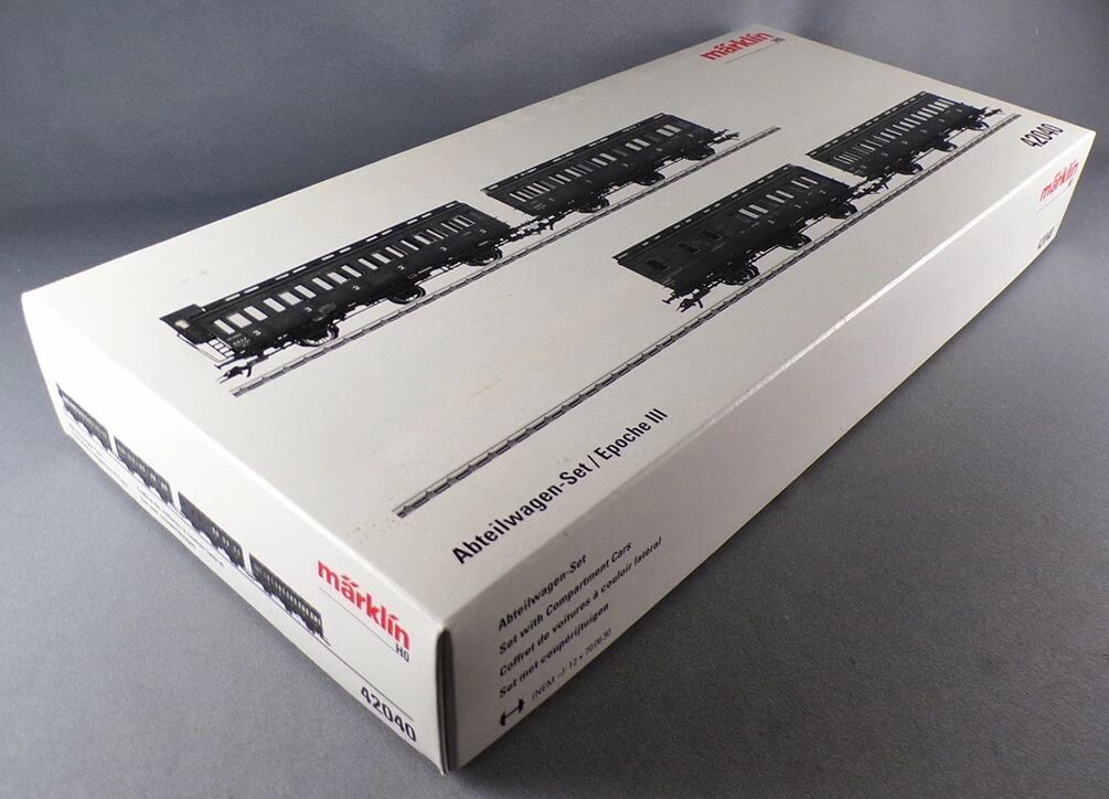 Märklin 42040 Ho Sncf Coffret de 4 voitures 3 essieux à couloir latéral ex voitures prussienne. Version vers 1952. Une voiture 1re classe et 2nde classe sans guérite de frein (A2B3t), une voiture 2nde et 3e classe avec guérite de frein (B2C4tf), une voiture 3e classe sans guérite de frein (C6t) et une voiture 3e classe avec compartiment bagages sans guérite de frein (C3Dp). Longueur 160 mm. Avec aménagement intérieur, boitier Nem, Epoque 3. Equipé pour 12V Courant alternatif type trois rails. Neuf en boite d'origine, n'ont jamais roulé