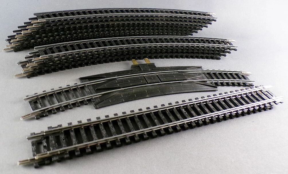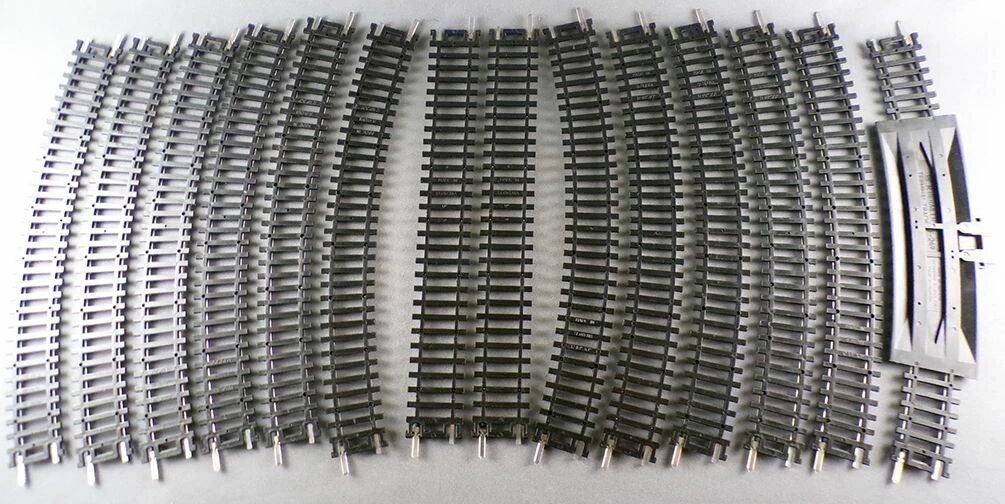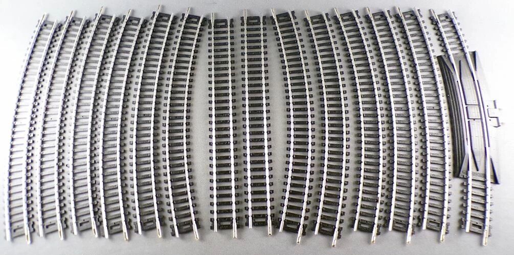 Mehano Ho 12 Curves R 18" 30° including supply & rerailer one + 2 straight 230 mm, steel tracks . Mint, unused, complete with fishplate on both ends.