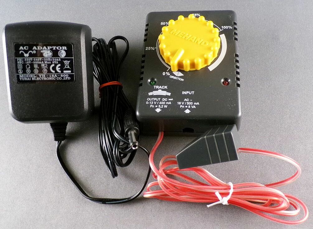 Mehano Ho Juhai electronic adapter YH-16A - 500 input CA 220V 50Hz to output 16V CA 500mA 8VA + speed controller input AC 16V Pn = 8VA to tracks DC 0-13V 400mA Pn = 5,2W. Very good condition.