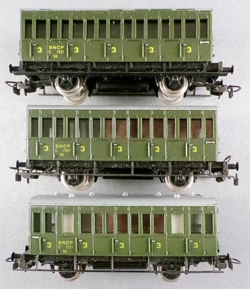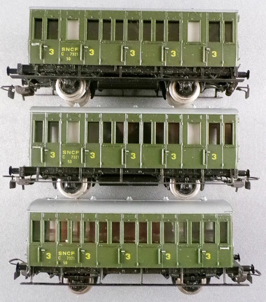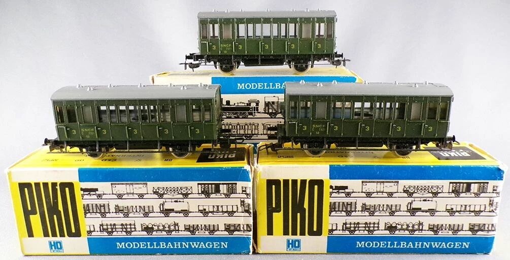 Piko 6515 071 Ho Sncf 3 Voitures de 3ème classe à marchepieds latéraux en métal immat C 7321 , ex voiture prussienne C sa 95, livrée vert toit gris, attelages à boucle, roues métal. Epoque II. Longueur 110mm. Neuves en boite d'origine, nont jamais roulé, complète, tampons & marchepieds ok