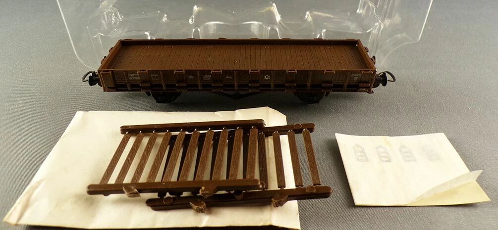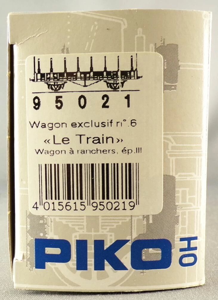 Piko 95021 Ho Sncf Wagon flatcar with low sides and ranchers JQo registration number 125087 brown livery. Ep III. Length 105 mm, burnished metal wheels, Nem universal couplers. Mint in original box with decals and ranchers on sprue in paper envelope. Exclusive modele #6 for the magazine Le Train
