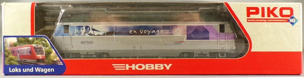 Piko 95159 Ho SNCF Diesel locomotive BB 867540 En Voyage livery with reversed lighting, Ep V cap logo. Length 195mm, digitalized, address 41. Very good condition, missing buffers, lightly used, tested in analog mode, works, lighting ok, in original box with instruction sheets and catalog