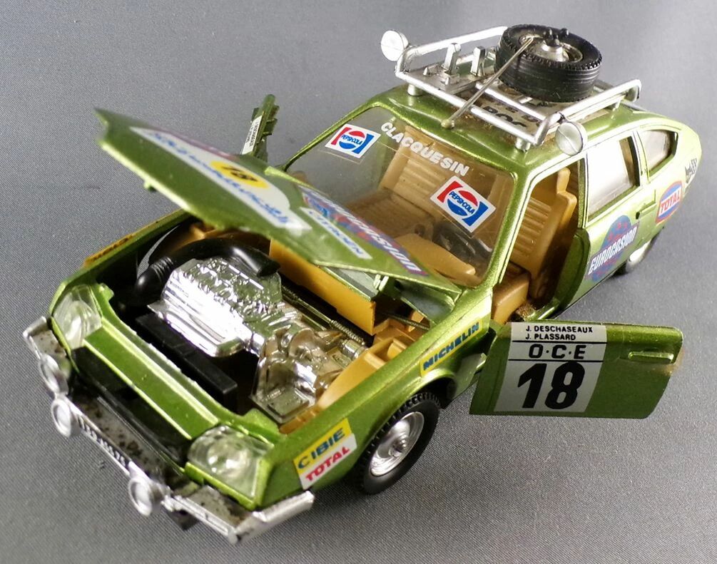Polistil S38 S685 Citroën CX 2200 Rallye du Maroc N°18 verte 1/25 sans Boite. Très bel état, 100% d'origine, ni retouche ni pièce repro, avec portières avants, coffre et hayon ouvrants. Manque grille de désensablage sur la galerie de toit, un phare longue portée et essuie-glace cassé.