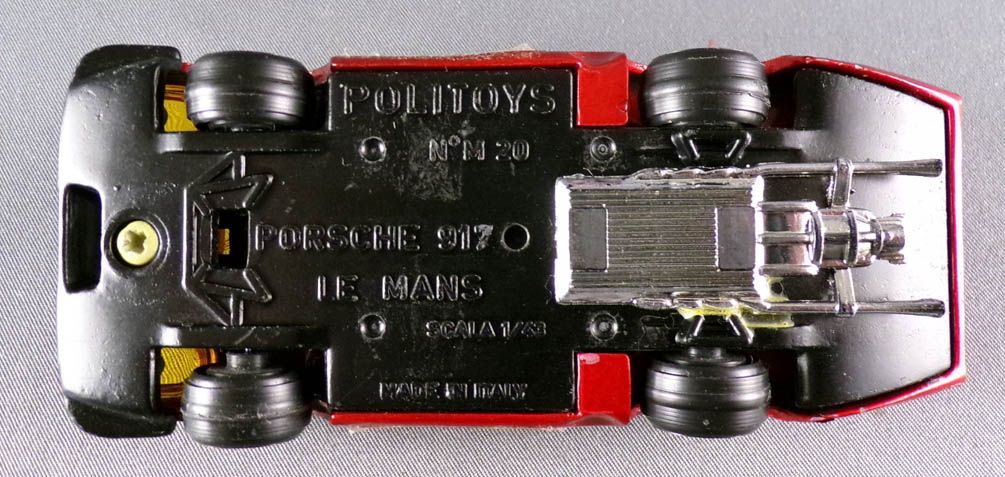 Politoys-M 20 Porsche 917 Le Mans rouge métallisé, suspension ok, portières et coffre ouvrants, aménagement intérieur sièges bacquets. Très bon état en boite cristal, 100% d'origine, ni retouche ni pièce repro, quelques petites têtes d'épingle sur la peinture.