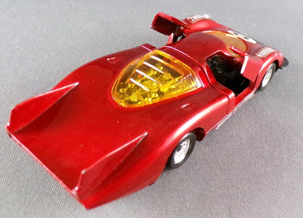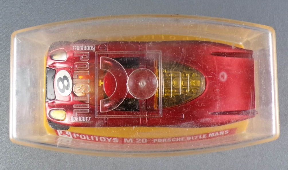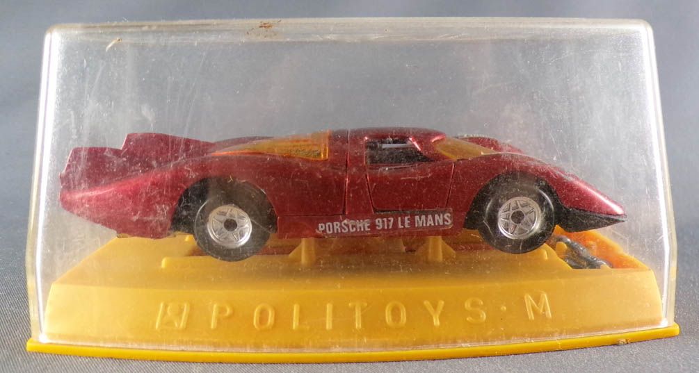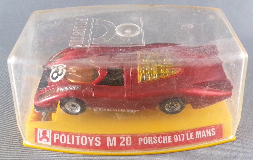 Politoys-M20 Porsche 917 Le Mans red metallic with spring suspension, opening doors and boot, detailed interior. Very good condition with crystal box, 100% original, not repainted, no touch-up neither repro parts, some needle heads on paint, please see pictures.