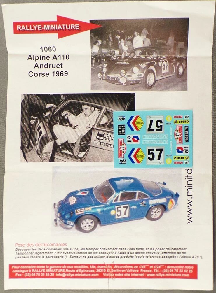 Accueil > Véhicules Miniatures > Autres véhicules miniatures > Rallye-Miniature - Planche de Décalcos Decals - Alpine A110 Andruet Corse 1969 1/43