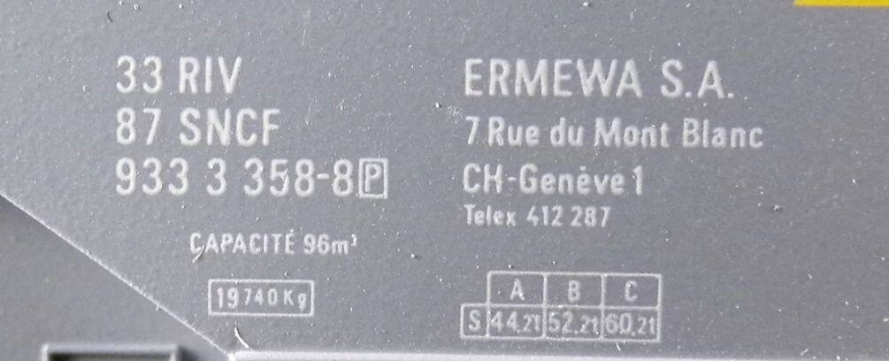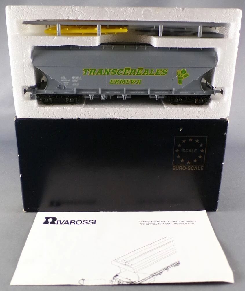 Rivarossi Euro-Scale 8707 Ho Sncf Wagon Trémie Uas Transcéréales Ermewa Immat 33 87 933 3 358-8 livrée gris. Longueur 170 mm, roues métal attelages Nem. Neuf en boite avec notice, jamais roulé, détaillage sur grappe.