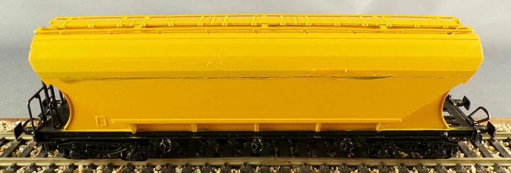 RMA 232 Ho Sncf Cereal hopper wagon with bogies Sanders Person & Le Guillouzic Frères yellow livery. Length 170 mm, metal wheels, universal couplers. Mint in box, built, marking in sealed bag, axles and wheels slightly corroded.