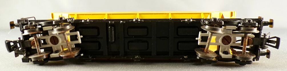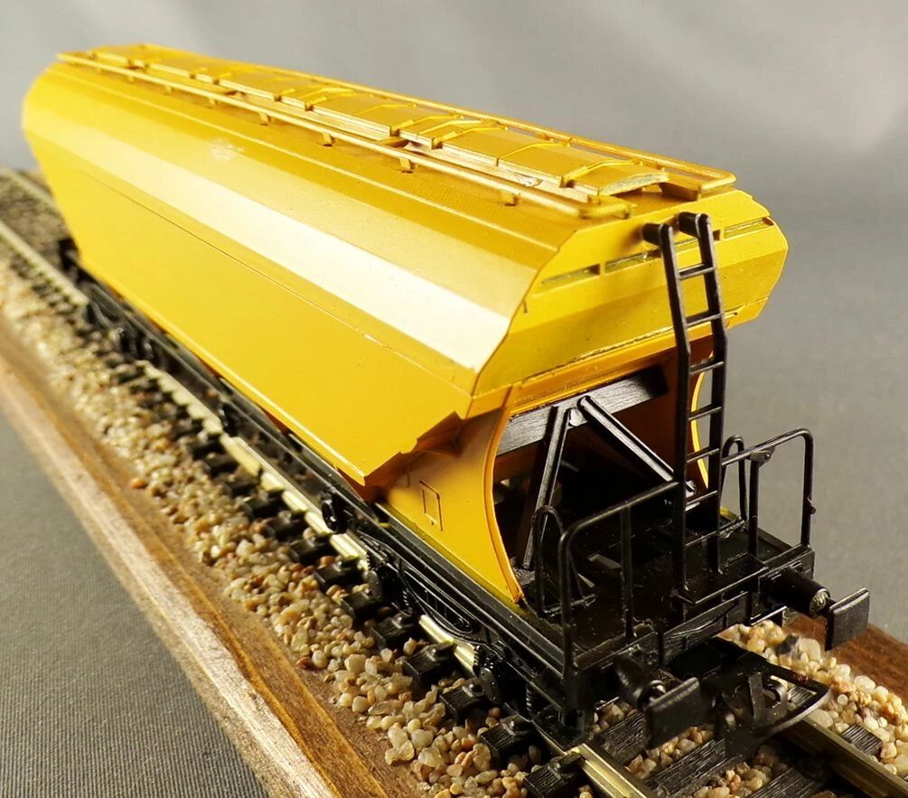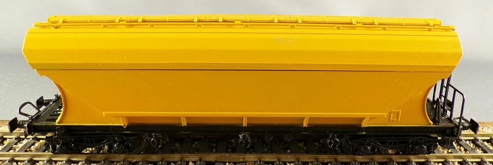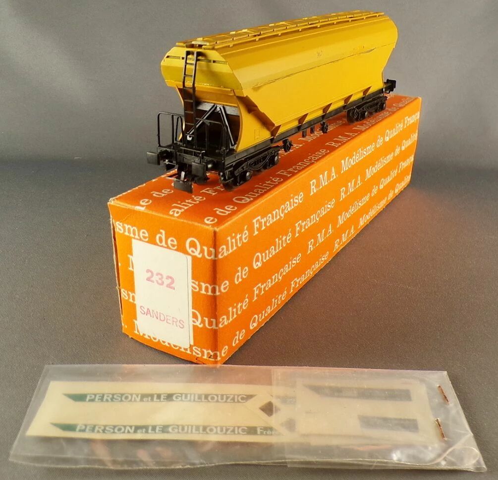 RMA 232 Ho Sncf Wagon trémie céréalière à bogies Sanders Person et Le Guillouzic Frères livrée jaune. Longueur 170 mm, roues métal, attelage à boucle.  Neuf en boite, assemblé, marquage sous sachet scellé, petite corrosion sur les roues et essieux.