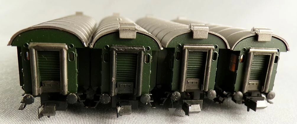 Avec aménagement intérieur détaillé, livrée vert toit gris. Longueur 83 mm. Neuve en boite d'origine, roues métal bruni, attelages Roco, complète, tampons ok, n'ont jamais roulé, boites en bel état.
