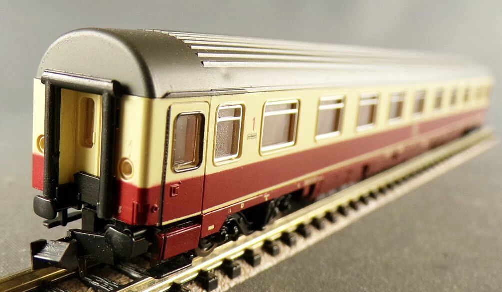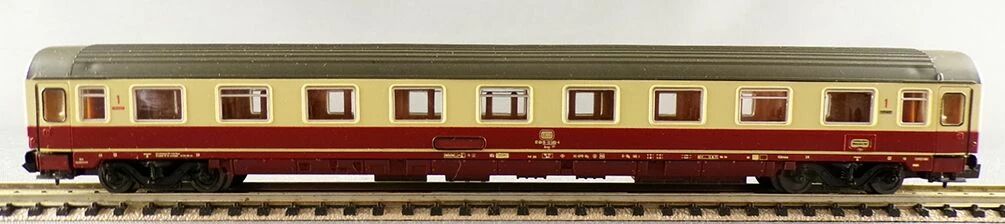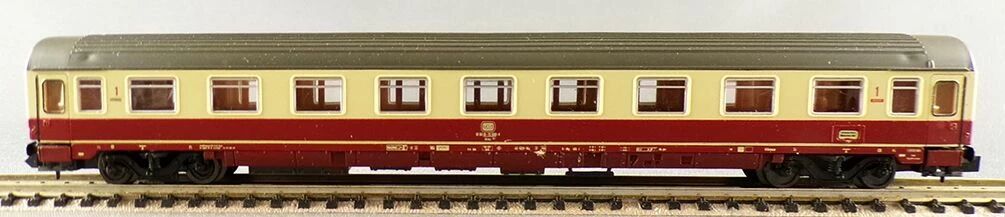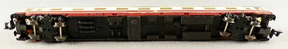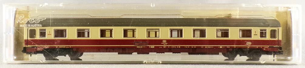 Roco 2261 B Ech N Db Voiture Ic/Ec Eurofima 1ère Classe type Amz immat 61 80 19-70 599-4 Avec aménagement intérieur détaillé, livrée crème et rouge brique bordeaux toit gris. Longueur 162 mm. Neuve en boite d'origine, roues métal bruni, attelages Roco, complète, tampons ok, detaillage sur grappe sous sachet, boite en bel état.