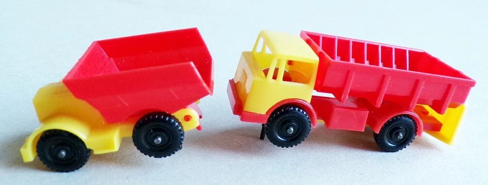 Taille : Camions 7,3 & 5 cm, train 29 circuit 54,5 x 38,5 cm Boite 55 x 39 x 12,5 cm.